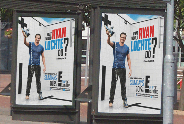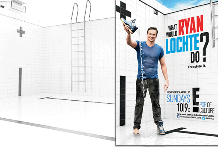 E! Television gave Olympic swimmer, Ryan Lochte, a reality show. All marketing was based upon his being in a pool. However, tiled, Olympic sized pools are hard to find and expensive to rent, drain and refill. With the premiere date rapidly approaching, E! shot him against generic backgrounds. But without the pool, no one recognized him. We had a solution. We built a custom 3D pool, provided them multiple angles for comping, and did it all within a day and a half. Once art was approved, we delivered a 9K render large enough for outdoor graphics. In addition we separated elements like the ladder, tiles, reflections and shadow passes onto different layers so they had the flexibility to alter the art as needed for various advertising formats.