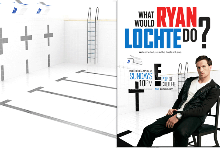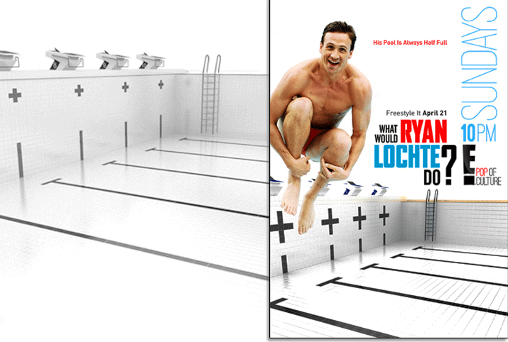 E! Television gave Olympic swimmer, Ryan Lochte, a reality show. All marketing was based upon his being in a pool. However, tiled, Olympic sized pools are hard to find and expensive to rent, drain and refill. With the premiere date rapidly approaching, E! shot him against generic backgrounds. But without the pool, no one recognized him. We had a solution. We built a custom 3D pool, provided them multiple angles for comping, and did it all within a day and a half. Once art was approved, we delivered a 9K render large enough for outdoor graphics. In addition we separated elements like the ladder, tiles, reflections and shadow passes onto different layers so they had the flexibility to alter the art as needed for various advertising formats.